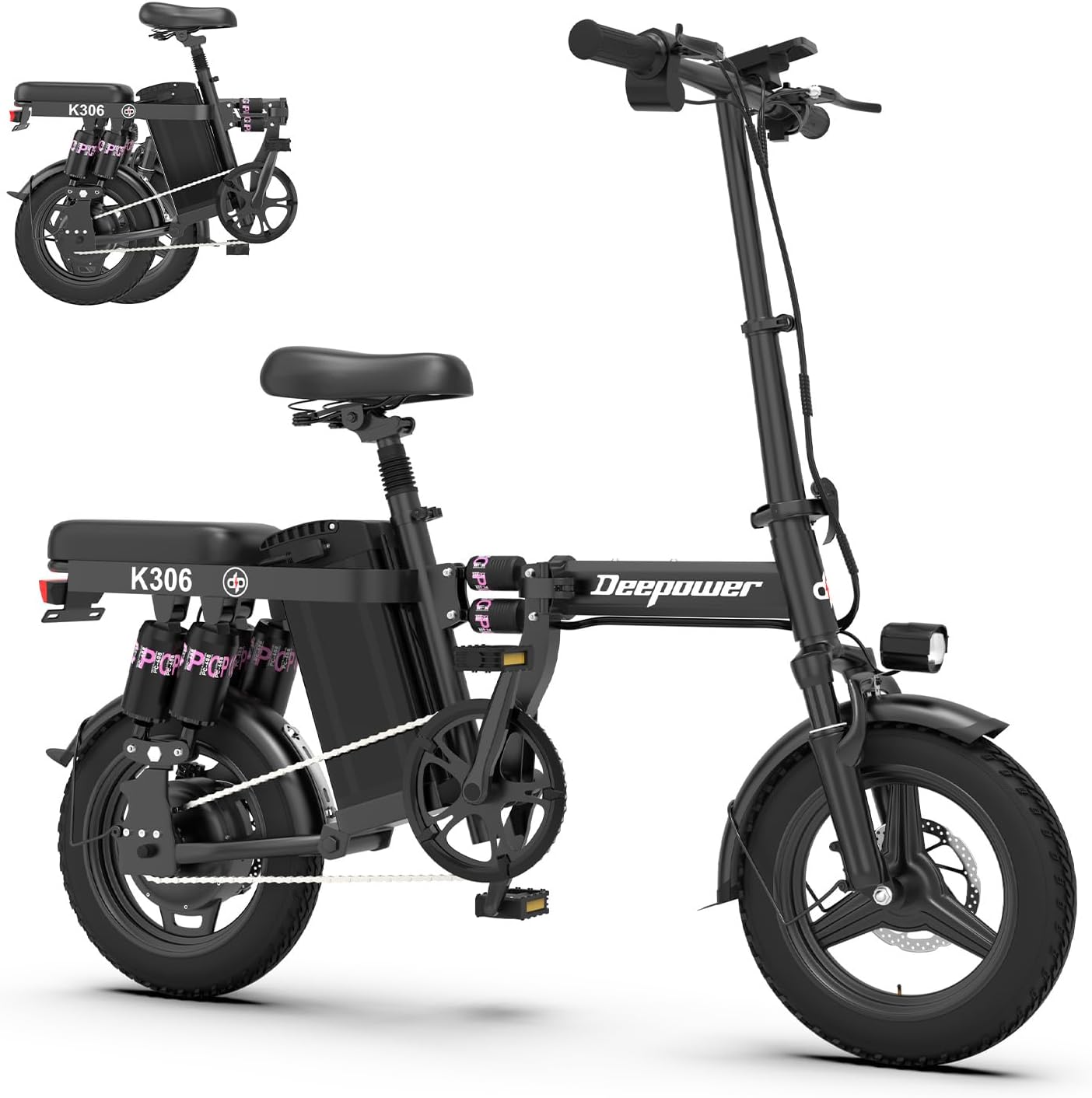 DEEPOWER Bicicletta Elettrica Pieghevole 14 Pollici 48V Batteria Rimovibile 10Ah 17.5Ah 30Ah 3 Modalità di Guida Doppia Sospensione Freni a Doppio Disco E-Bike per Adulti e Adolescenti
